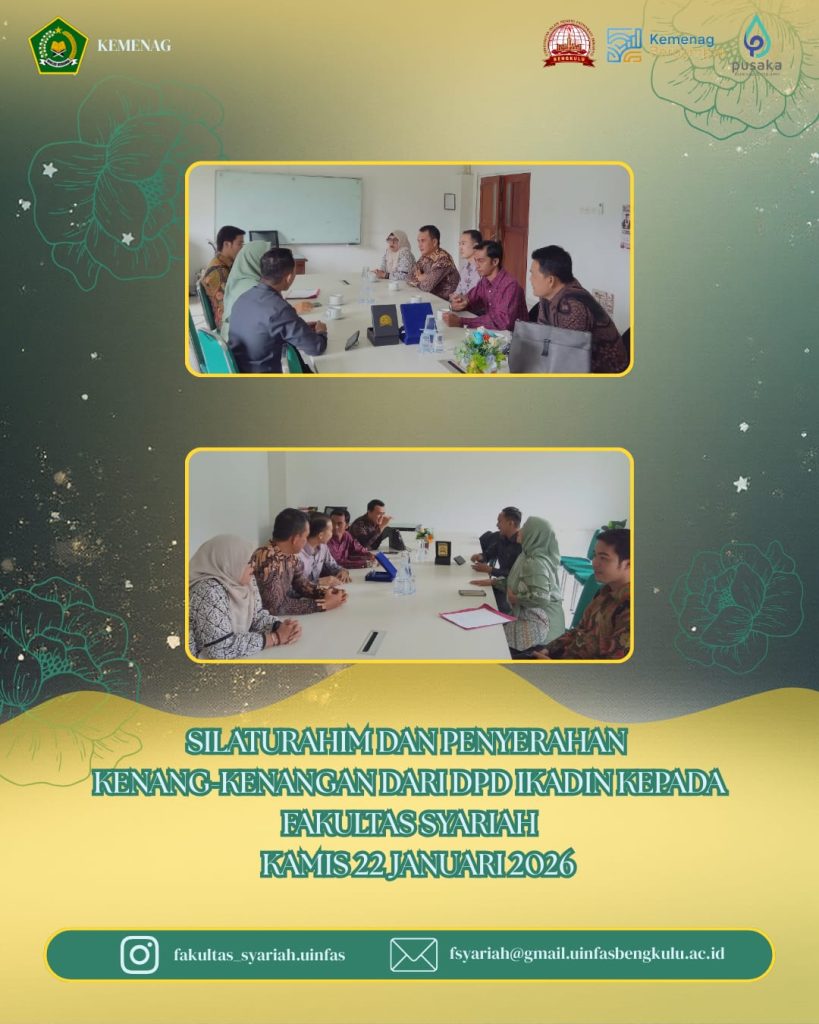 Fakultas Syariah Universitas Islam Negeri Fatmawati Sukarno (UIN FAS) Bengkulu menerima kunjungan silaturahmi dari Dewan Pimpinan Daerah (DPD) Ikatan Advokat Indonesia (IKADIN) Provinsi Bengkulu dalam rangka penyerahan kenang-kenangan sebagai simbol komitmen kerja sama Pendidikan Profesi Advokat (PPA) IKADIN Tahun 2025.