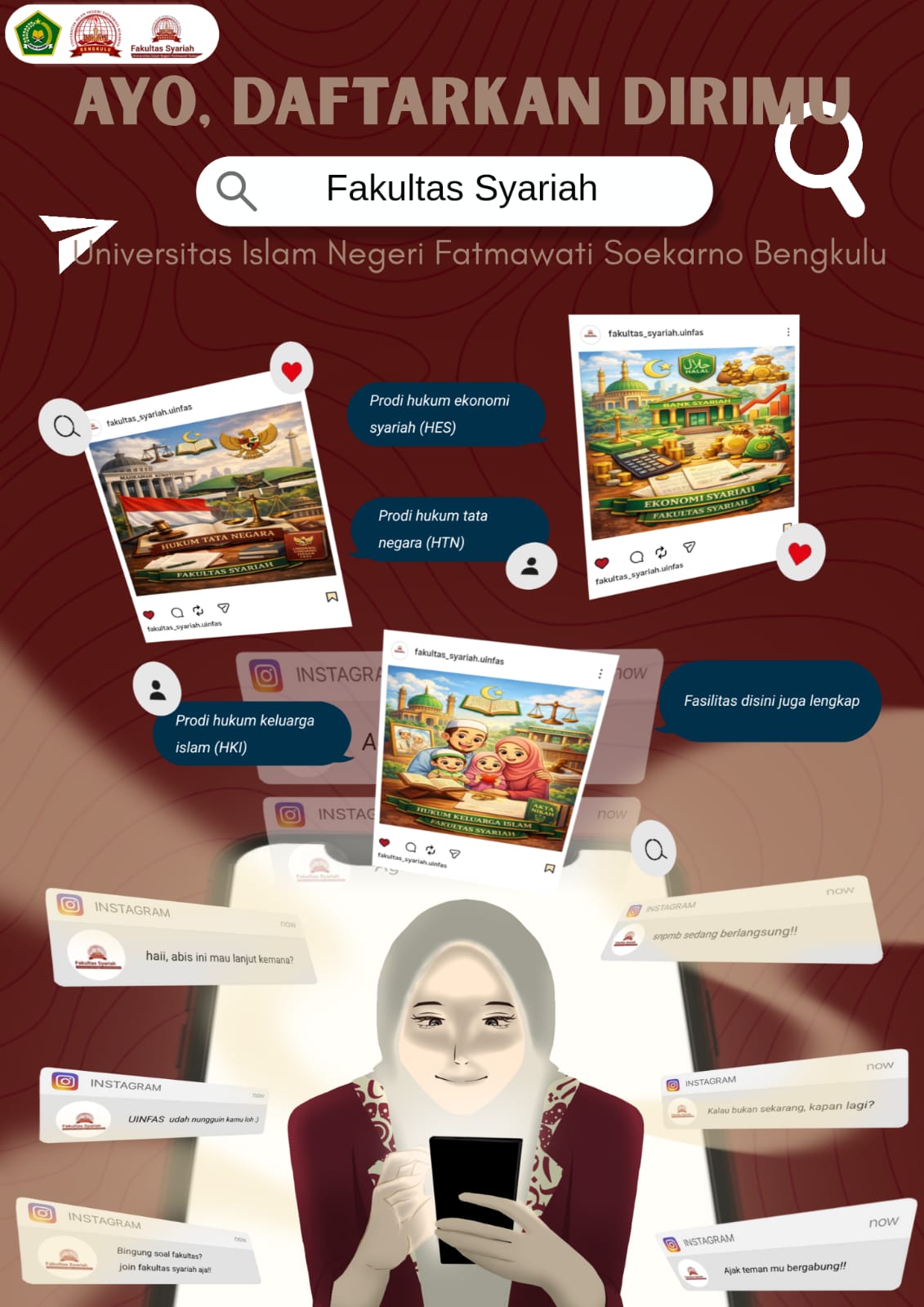 Saatnya menentukan masa depan bersama Fakultas Syariah. Fakultas Syariah hadir sebagai pusat pengembangan keilmuan hukum dan ekonomi Islam yang unggul, moderat, dan berdaya saing global. Didukung oleh dosen profesional, kurikulum berbasis kebutuhan zaman, serta lingkungan akademik yang religius dan inklusif. Melalui jalur SNPMB 2026, kami membuka kesempatan bagi generasi muda untuk menjadi sarjana hukum dan praktisi syariah yang berintegritas, berkeadilan, dan siap berkontribusi bagi masyarakat, bangsa, dan umat. ✨ Pilih Fakultas Syariah, pilih masa depan yang bernilai dan bermartabat. 📌 Ayo bergabung bersama Fakultas Syariah! Wujudkan cita-citamu, perluas wawasan keislaman dan hukum, serta jadilah agen perubahan di era modern. #UINFASBengkulu #SNPMB2026 #FakultasSyariah #SyariahMajuBersama