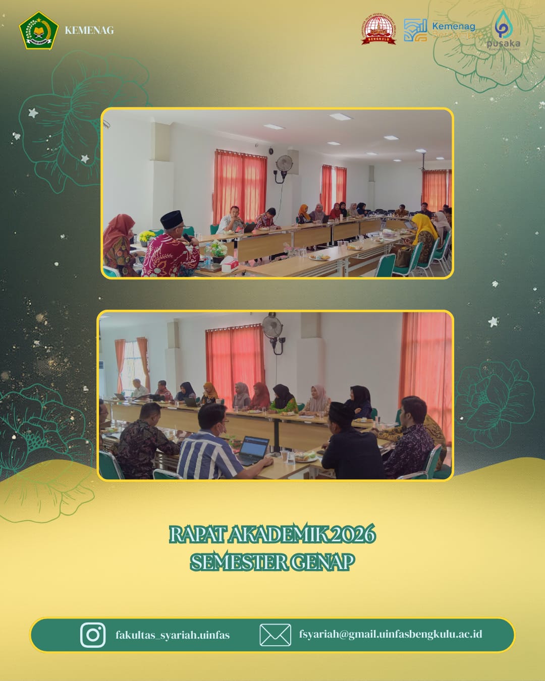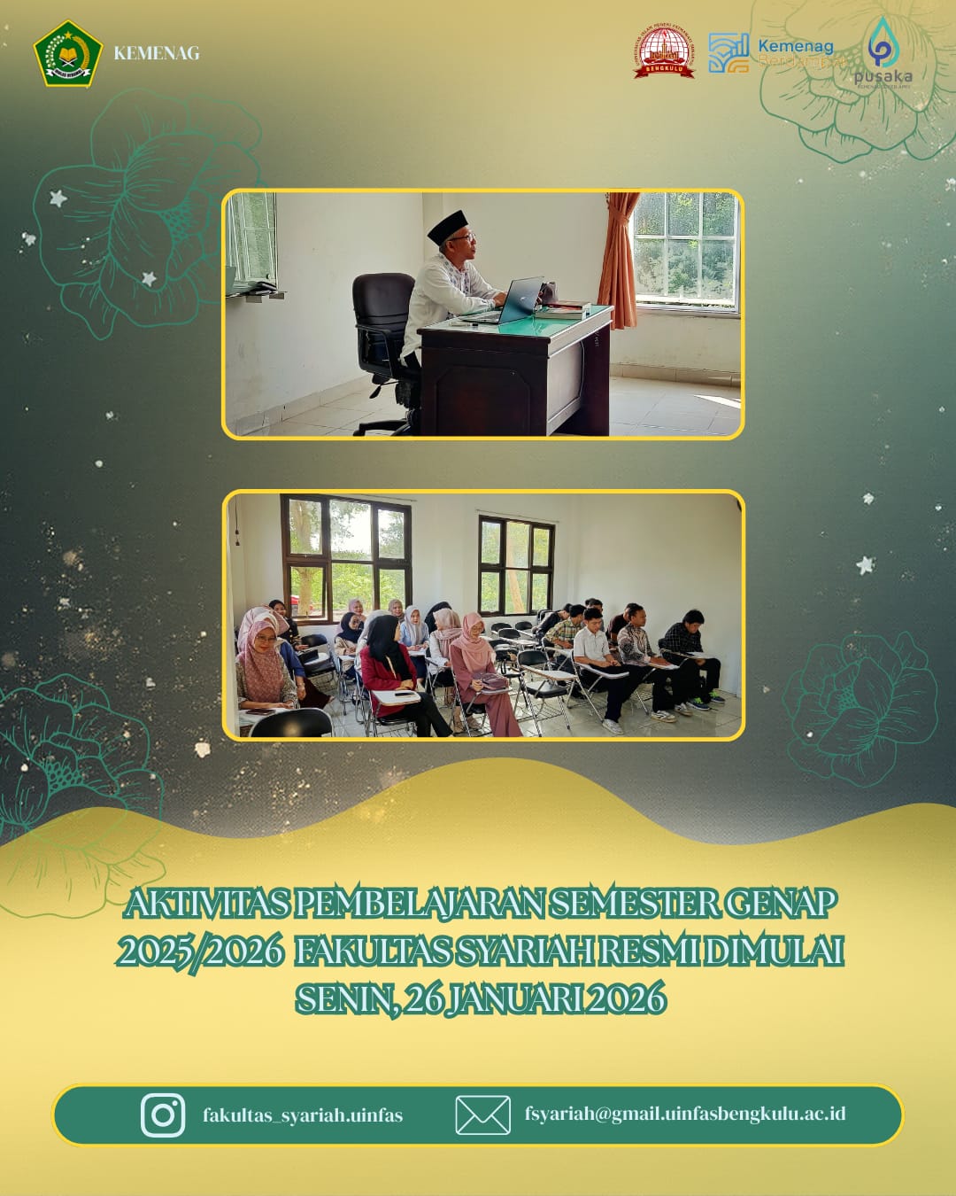 Dengan dimulainya aktivitas pembelajaran semester genap ini, diharapkan seluruh mahasiswa Fakultas Syariah UIN Fatmawati Sukarno Bengkulu dapat mengikuti perkuliahan dengan disiplin, semangat, dan tanggung jawab guna mencapai prestasi akademik yang optimal.
