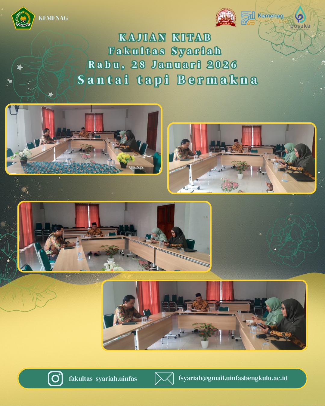 Bengkulu — Fakultas Syariah UIN Fatmawati Sukarno Bengkulu kembali menghidupkan tradisi keilmuan melalui kegiatan Kajian Kitab yang dilaksanakan pada Rabu, 28 Januari 2026. Kegiatan ini berlangsung dalam suasana santai namun tetap sarat makna dan nilai akademik.